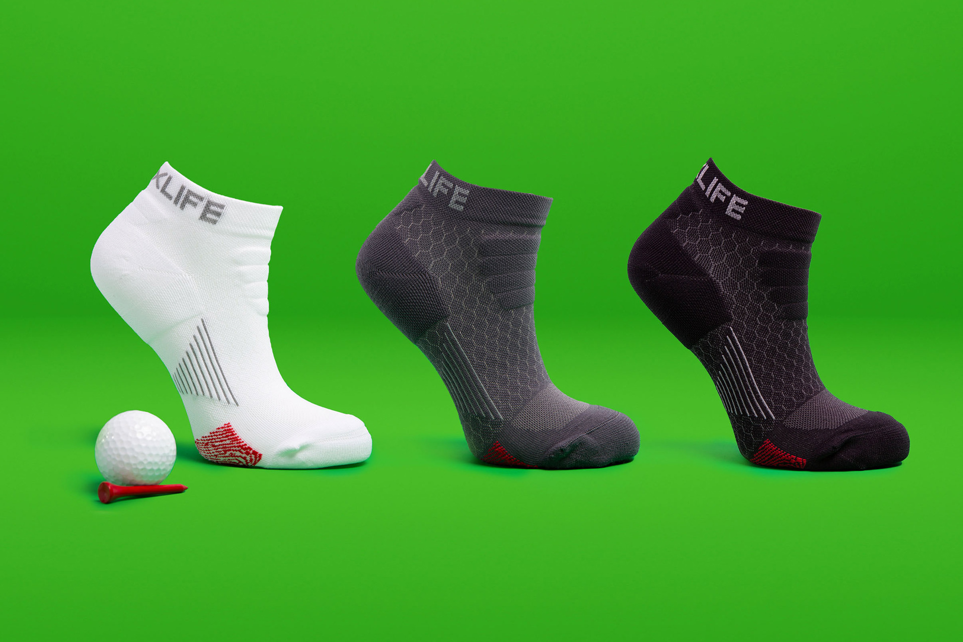 By moving product photography in‑house, I created high‑res, 3D‑styled visuals and composited the golf socks into realistic golf course scenes, replacing basic flat mockups with campaign‑ready images that saved time and avoided costly on‑location shoots.